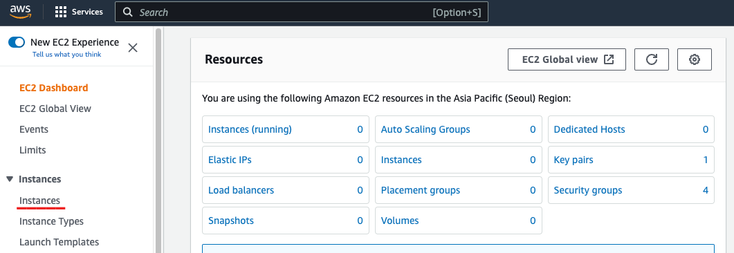메인 콘솔룸에서 서비스란에 EC2를 검색해 가장위에 뜨는 것을 눌러준다.