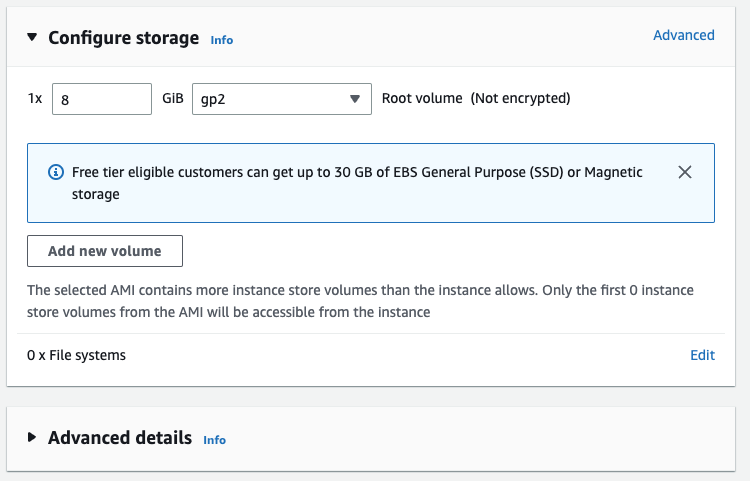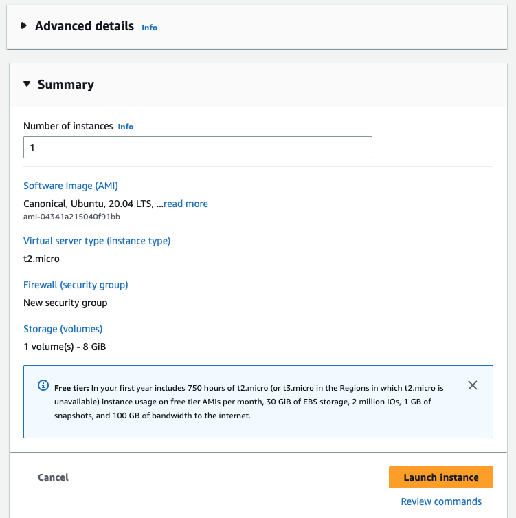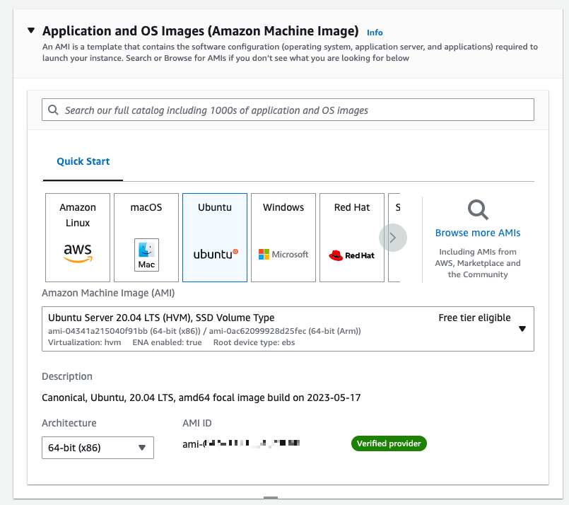 20.04 LTS로 선택했다. Free tier eligible라고 써있는데 Free tier인지 잘 확인해야 서버 비용이 나가지 않는다.